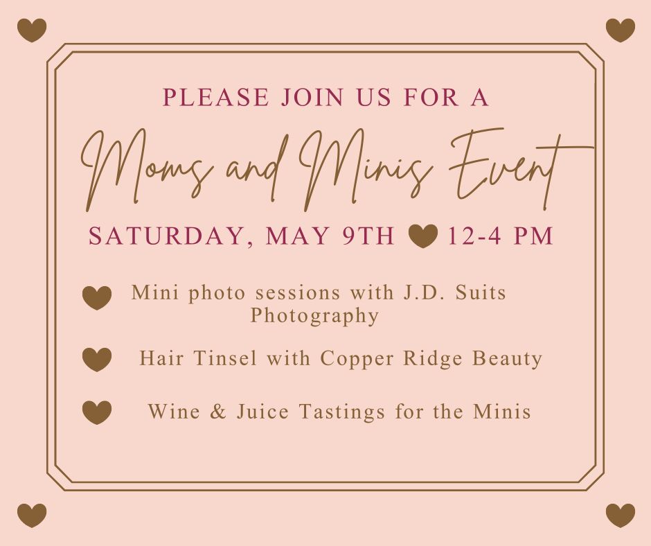 Moms & Minis! Please join us for a Moms and Minis Event! We will have mini photo sessions with J. D. Suits Photography, Hair Tinsel with Copper Ridge Beauty, and wine (or juice!) tastings.