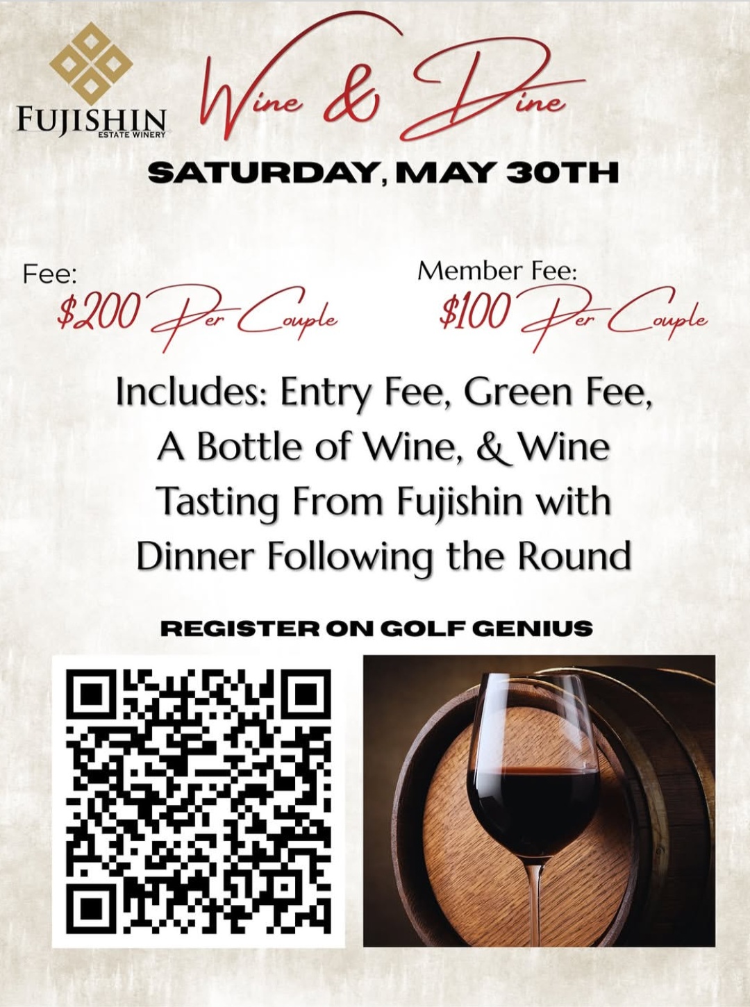Saturday, May 30th at 5:30 pm (at Timberstone Golf Course) Wine, dine, and golf with us at Timberstone Golf Course! Find more information and register below: Fujishin Wine & Dine