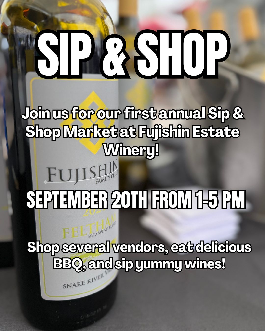 Sip & Shop at the Estate -Saturday, September 20th from 1-5 pm Join us for our first annual Sip and Shop Market at the Estate! We will have several local vendors selling goods, delicious BBQ to eat, and of course yummy Fujishin wines to drink while you shop around. |