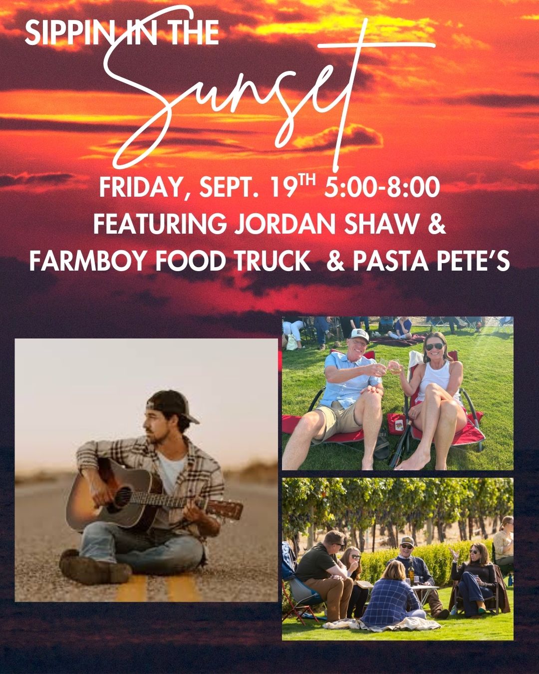Savor the fleeting moments of summer at our Sippin in the Sunset on Friday, Sept. 19th from 5-8 pm. Bring your friends and bring your lawn chairs and soak up the soulful sounds of Jordan Shaw while enjoying award winning wine and delightful entrees by Pasta Pete’s and Farmboy Food Trucks. Kick back and relax with […] |